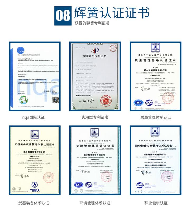 輝簧彈簧公司開發(fā)、生產(chǎn)、經(jīng)營汽車電機(jī)電器彈簧。我公司生產(chǎn)的彈簧分類有壓縮彈簧(普通壓縮彈簧,中凹壓縮彈簧,中凸壓縮彈簧,塔型壓縮彈簧,漸近壓縮彈簧,左旋壓縮彈簧,右旋壓縮彈簧)、扭轉(zhuǎn)彈簧(普通扭轉(zhuǎn)彈簧,雙扭轉(zhuǎn)彈簧,異形扭轉(zhuǎn)彈簧,左旋扭轉(zhuǎn)彈簧,右旋扭轉(zhuǎn)彈簧)、拉伸彈簧(普通拉伸彈簧,單鉤拉伸彈簧,雙鉤拉伸彈簧,掛鉤拉伸彈簧,拉環(huán)拉伸彈簧,非密圈拉伸彈簧,左旋拉伸彈簧,右旋拉伸彈簧)、異形彈簧、渦卷彈簧、卡簧擋圈、波形彈簧、碟形彈簧、沖壓彈簧等彈性元件。